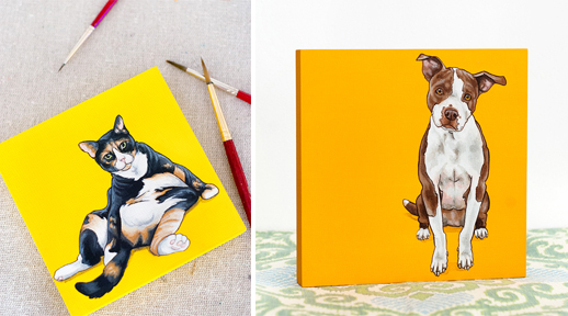 4. And finally, last but certainly not least, everybody’s most coveted pet-related gift: a hand-painted custom mini pet portrait from the Pet Shop!  My brother and I think this one would make an especially awesome gift for your most favoritest person on the planet. Who wouldn’t go totally nuts for one of these beautiful custom portraits? Since the holidays are so close, you’ll receive a beautifully packaged gift certificate for an original, custom portrait. Here is my favorite painting of Kim’s — of my brother the Bug — and also one of a cat, just so you remember that she’s not only about us dogs. She has even done rabbits, guinea pigs, and regular pigs! Amazing? Definitely.