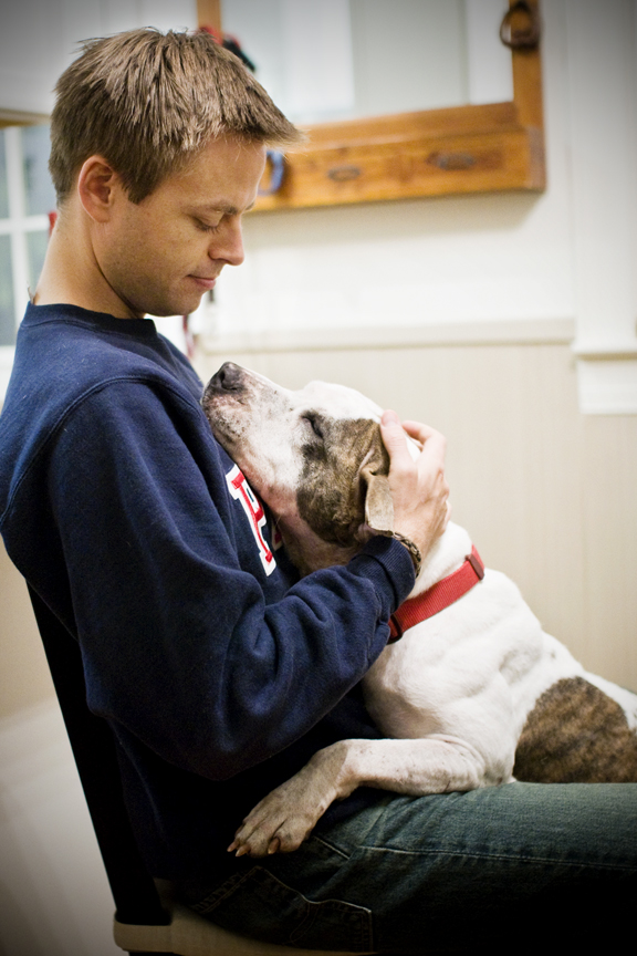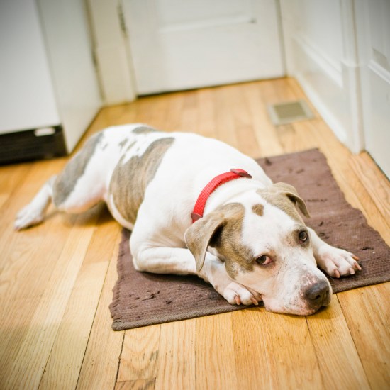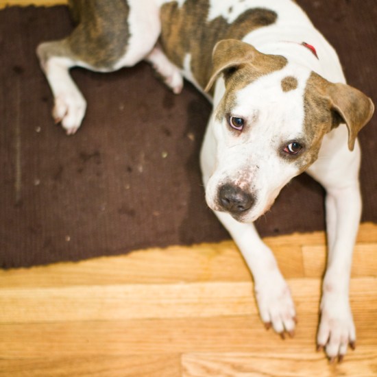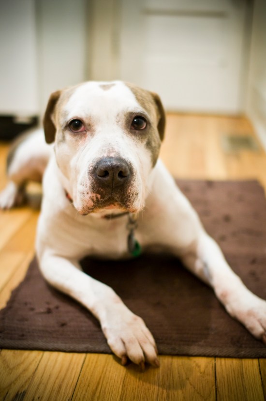 Inspired by yesterday’s segment, I decided it was time for Lollie to learn to not be under foot while I’m cooking dinner (a pit bull drooling over dinner prep in a vegan kitchen? seriously?). I had been avoiding the down-stay since the beginning because although Lollie is a total genius, she is also somewhat distractable (I have heard that this is very common in dogs who were understimulated early in life). But, I resolved, tonight is the night we begin. So I armed myself with a bowl of kibble and set to work. Within a couple of minutes, she was calmly laying down as long as I kept the treats coming. Over the course of 15 minutes, I was able to progress to 30 second intervals with the treats. After a few more minutes, I was able to briefly leave the kitchen and come back, and she would still be on the designated rug. I dropped a piece of kibble on the floor, out of reach. No movement. I jumped up and down. Nothing. Incredible. The work is not done and hurdles lay ahead, but this is a much more solid start than I could have even hoped for.