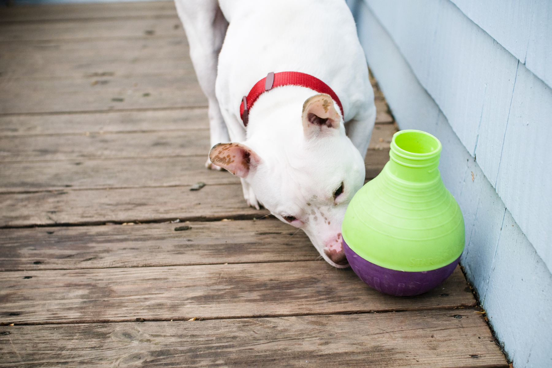 This one is the StarMark Bob A Lot, but it’s very similar to the Kong Wobbler. Essentially, it’s a bottom-weighted, pear-shaped toy.  You pour food into an opening, screw the top on, and watch.