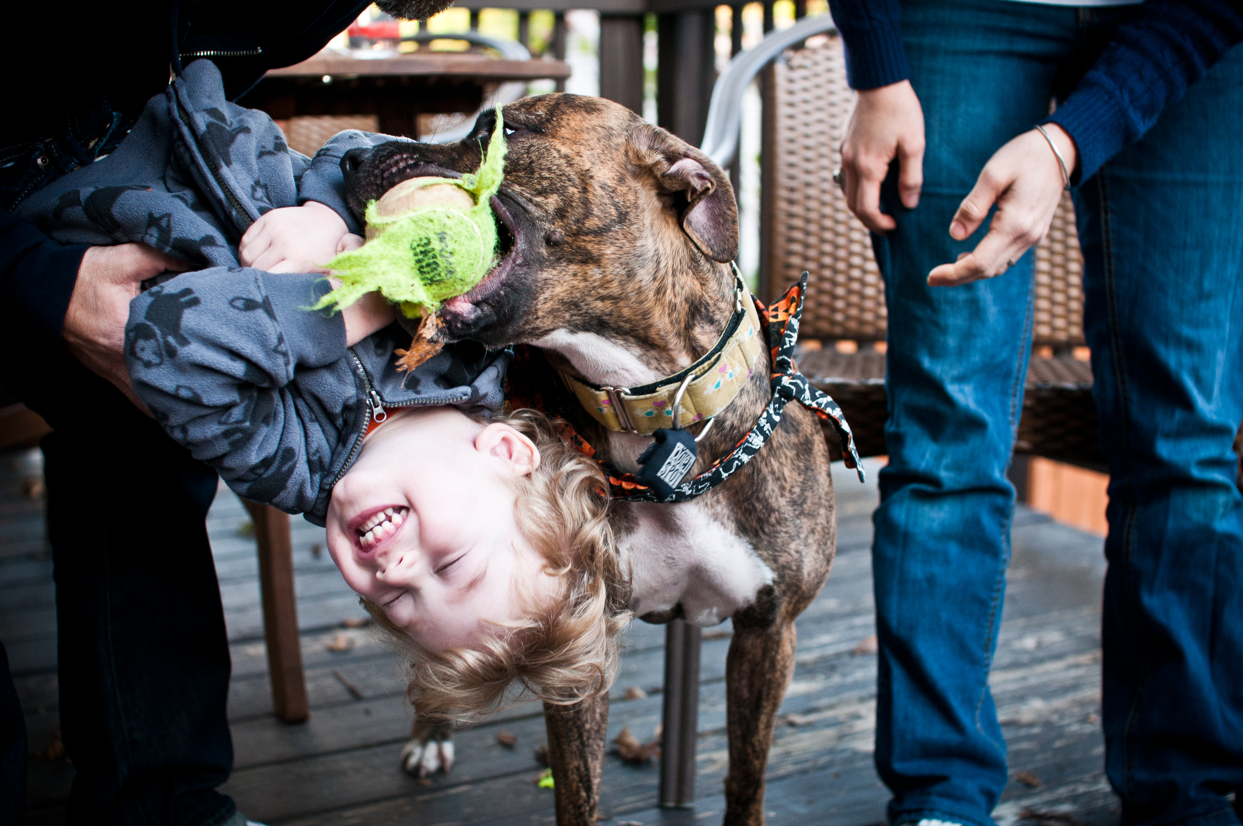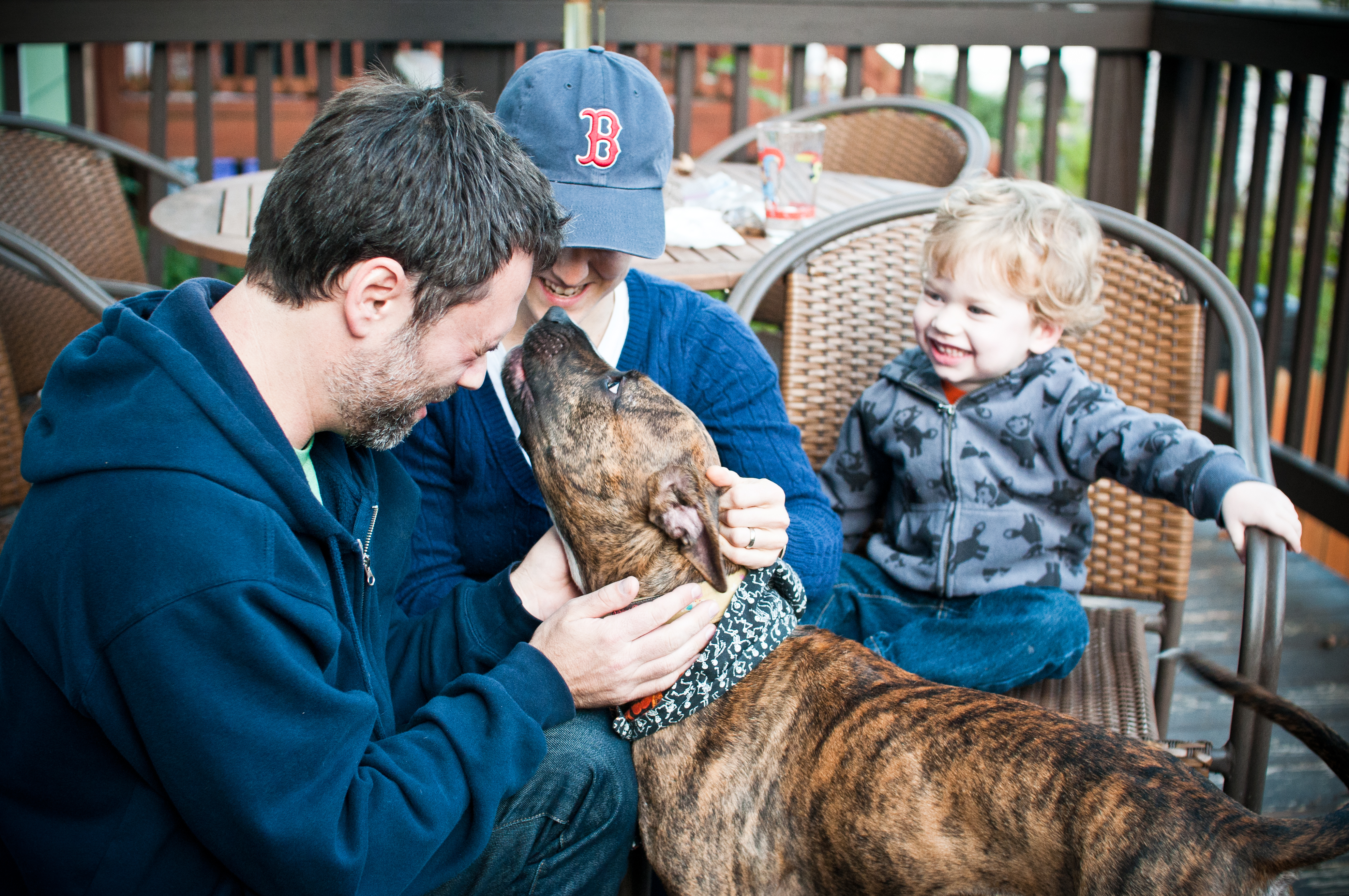 Needless to say, Stevie is doing great. She is enrolled in class at the Washington Animal Rescue League, she goes for long walks with her family every morning and evening, and she gets to chase her beloved tennis ball down the deck stairs and across the yard every evening after school. Her darling brother Henry and mom take turns throwing the ball, and Stevie chases it with glee. We’ll let the photos do most of the talking here, because they really show the sweetness of her new family — from the big squeaky tennis balls they loyally buy her and let her destroy, to the “upside down kisses” that Henry likes to demonstrate with Stevie.