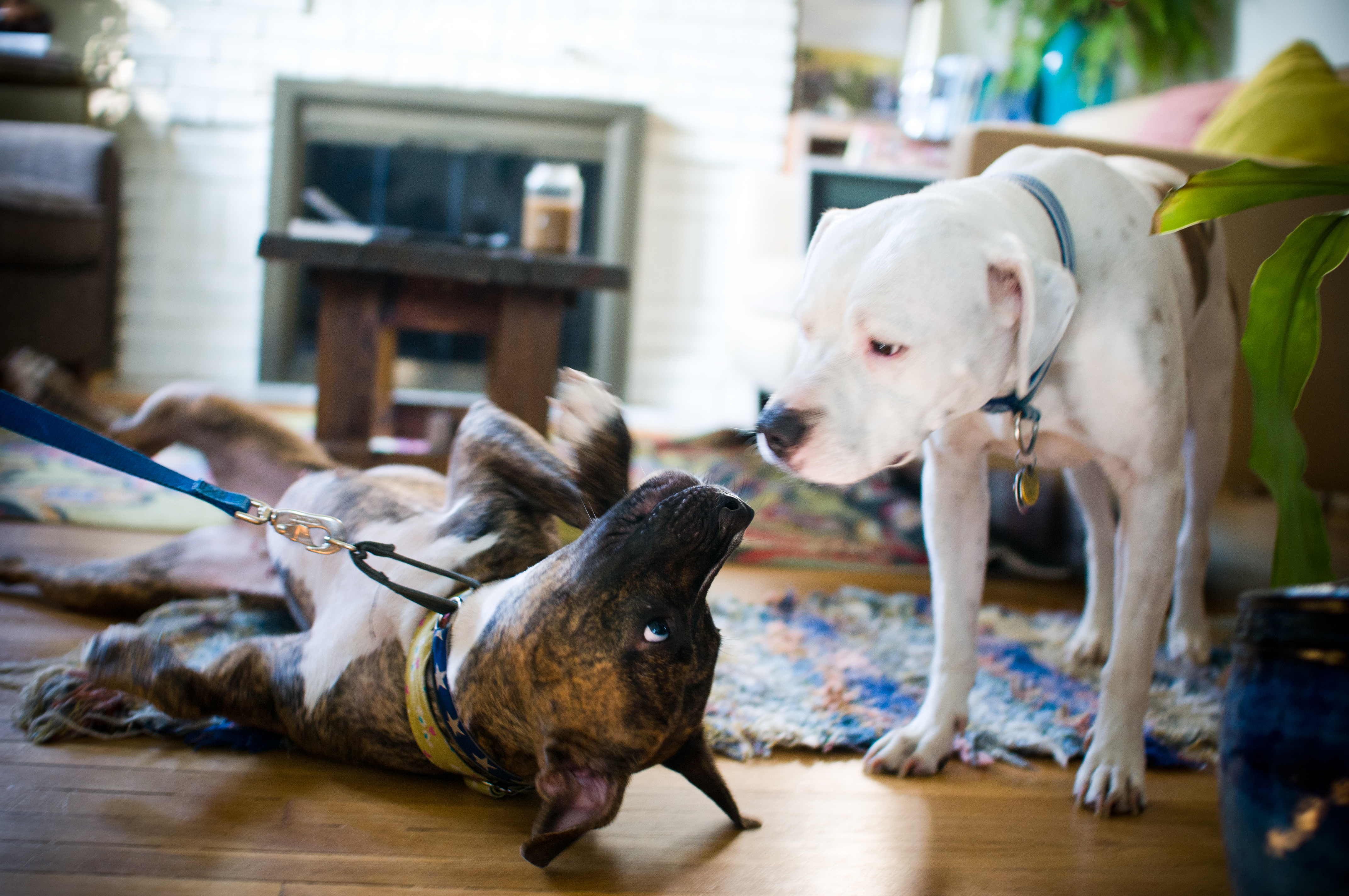 When introducing a new foster into our household, it is critical for us to ensure that the getting-to-know-you phase between our own Chick and the new dog goes as smoothly as possible. We take this phase very slow — in the past it has taken us anywhere from two days to a month to fully integrate our foster with our Chick. We have a regular routine that involves parallel walks, side-by-side obedience, baby gates, and finally the tiedown. Some organizations and advocates warn against using tiedowns in dog-dog interactions, and with good reason — if used incorrectly or not supervised properly, a tiedown can lead to teasing, abuse, frustration, and fighting. If you’re considering using one to smooth your own dog-dog integration, first make certain that the dog on the tiedown will not be pestered or bullied. This is critical.