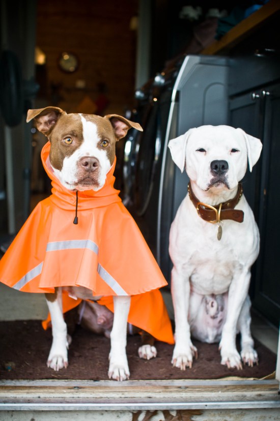 I don’t think I can choose–they both look smashing! Do they both actually enjoy wearing it? My boxer Gertie doesn’t particularly like the rain, but I think she would like it even less if I put a raincoat on her.