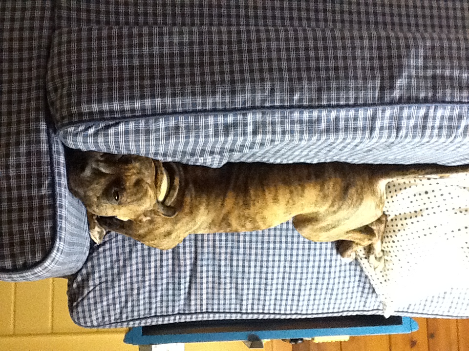 Have we told you,we adore her! She’s stretched out hogging up the entire carpet in front of the fireplacechewing happily on an antler….Love her!”