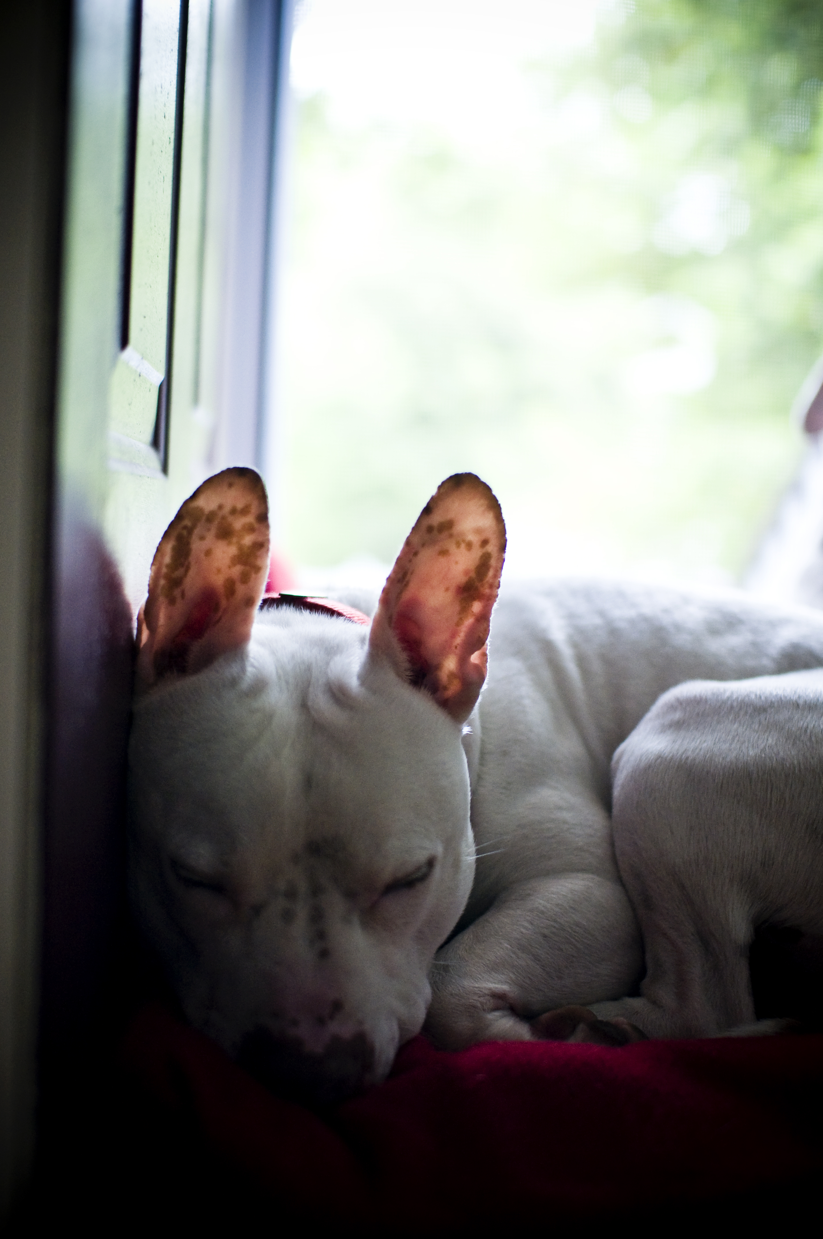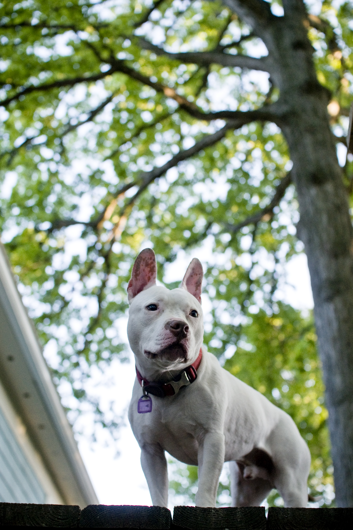 Much to my delight, T responded to my offer. I rushed to get in touch with friends at our local shelter, MCHS, who immediately recommended a sweet, young, timid pit bull girl named Precious. She even has cute, perky ears! Precious had been a shelter favorite because of her dainty, gentle nature and adorable, petite features, but as many pit bulls do, she kept getting overlooked. Unfortunately, her initial shelter photo kind of made her look like a haggard old lady: