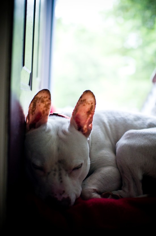 We first met T through her inquiry about adopting Gonzo. Her family is perfect. Two boys, one young, one older, a big fenced yard, nice flexible schedules, another dog — a lab — who loves to play. T is absolutely charming, and was equally charmed by Gonzo through his bio and his blog. Because of the young age of one of her children, her application was not a match (Gonzo is a bit nippy with toys and is not allowed to go to a family with kids under 4ish). Sad to be losing a great potential adopter, I emailed her right away, offering to suggest a few dogs at local shelters who met her general criteria (smallish pit bull type, dog- and cat-friendly, young, and cute ears — a la Gonzo — if possible). After all, spring is the season of dogs being put to sleep in huge numbers, so it’s also the best time to adopt.
