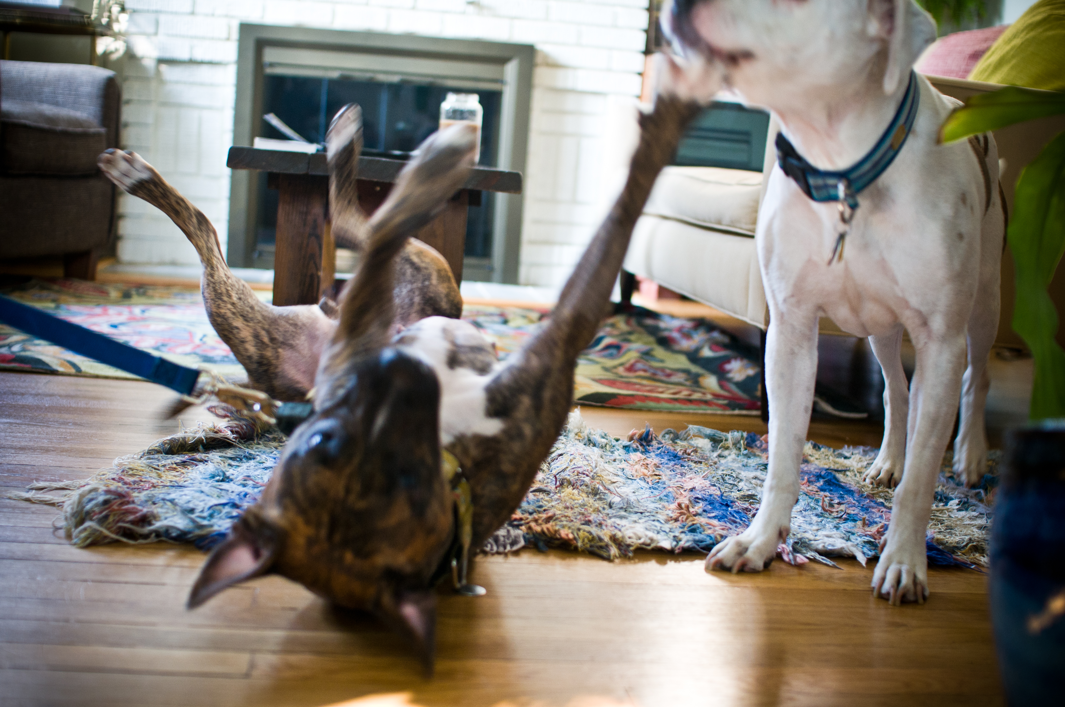 We’re not going to sugar-coat it: the love between Stevie Wonder and Sir Chick is NOT mutual. Sir Chick is a mature gentleman and he tolerates his foster sister’s affection, antics, and crazy puppy-like energy with grace and patience, but it is clear that her love for him is unrequited. Chick will politely tolerate most dogs, but there are very few that he truly loves. Our former foster Gonzo Bunny-Ears was one of the lucky few; Chick’s uncle Tex the black lab is another.