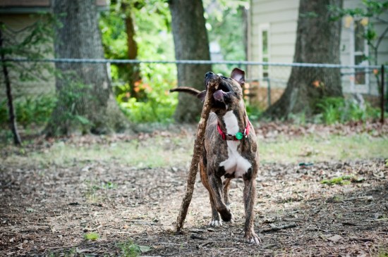 And what did she discover in her explorations? Mr. Chick’s favorite fetching stick! The moment she found it, we knew she was in love. She immediately picked it up in her mouth and started proudly trotting around with it dragging behind her. I called her over to me, and she dropped it, looking at me expectantly. A few throws, and I could see that this was the beginning of a happy daily activity. Check out the smile on Miss Wonder’s face!