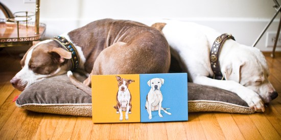Ok, now for our second surprise. Kim’s gorgeous custom pet paintings business has just gone under a giant makeover — both in real life and online! We have loved tracking the progress of the beautiful little hand-crafted room where she creates these beautiful 4″ and 6″ square works of art.