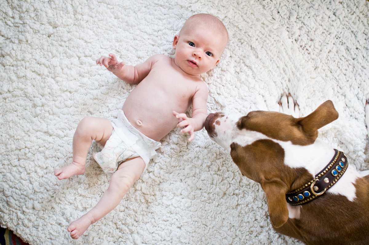 So in our house, we were especially careful about one thing. Before the dogs were allowed to interact with Puppy E at close range, they had to be totally over it. We did not want any tap-dancing paws, fast–wagging tails, or excited puppy kisses. We wanted total boredom. And we got it. How? Simple. When the baby first came home, we kept the dogs busy with plenty of enrichment activities. Lots of walks, stuffed bones and kongs to chew on, puzzle toys to play with, and slow, controlled–based exercises in the presence of the baby. Things like sit-stays and down-stays. After a few hours for Chick and a couple days for Doodlebug, they thought the baby was the most boring thing in the world. A total non-issue. And that was exactly what we wanted.
