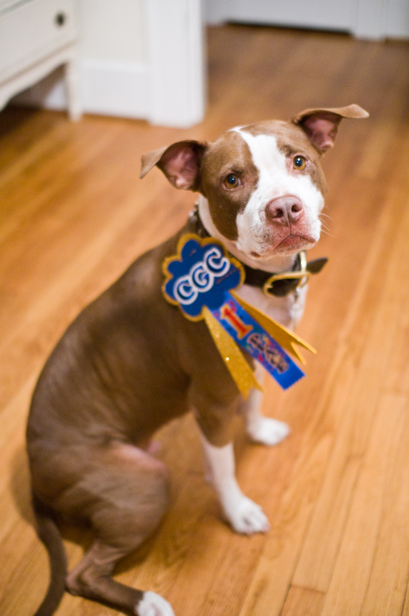 I first “met” Shiner through this blog when her owner, L, emailed me to ask about the Center’s reactive dog class. She and Shiner were in a class at another training facility where one of the methods of “training” Shiner not to react to other dogs was to jerk the leash so hard that Shiner would — literally — flip over. L had a bad feeling about the class and how things were going, and reached out to me to inquire whether the Center’s methods might be more up her alley. L had originally selected the other class because it was less expensive, and she and her partner needed to make the most of their limited training budget.