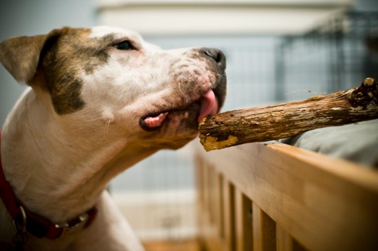 I thought that her fascination with the stick was so bizarre that I let her bring it inside and play with it for a while. At first, she whispered sweet nothings in its ear and lovingly caressed it with her tongue:
