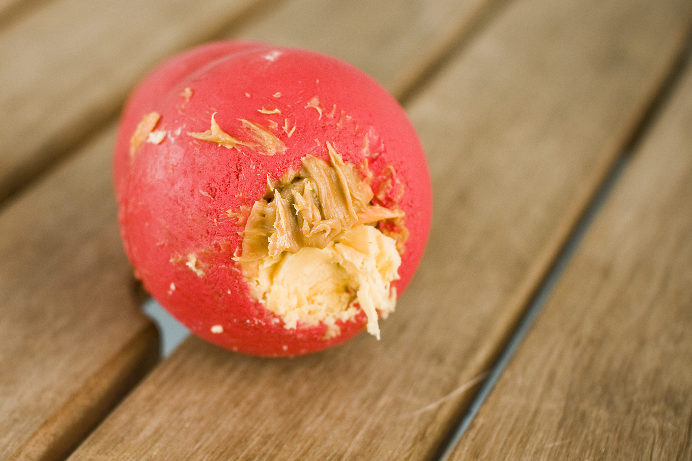Our second favorite is the grandfather of all dog puzzles, the kong. The easiest way to kong a dog is simply to scoop some kibble in, and seal the opening with something sticky – some peanut butter or cheese whiz works well. But this is too easy for our little geniuses.